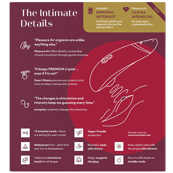 人気のウーマナイザーから待望の商品がリリース!「ウーマナイザー プレミアム2 (ボルドー)」。 その名に恥じないプレミアムな機能を搭載♪ボタンを押さなくてもお肌に当てるだけで吸引が自動でスタートし、離すだけで振動が止まるタッチセンサー機能を搭載。 この機能はカップルさんで使うときにも本当に大活躍します♪さらにパイロットモードを搭載し、ボタン操作をしなくてもWomanizer自身が吸引の強弱を自動でコントロールしてくれます。 これにより予測できないゾクゾクとした楽しみが味わえます♪振動レベルは弱・中・強の3段階!ゆったりとラグジュアリーな時間を過ごすのに最適です♪素材はシリコン/ABS樹脂で2時間のフル充電により連続4時間での使用が可能です。 ※製造時期によりパッケージが異なる場合がございます。 ※こちらの商品は受注発注商品の為、ご注文から発送までに3、4営業日掛かる場合が御座います。 |