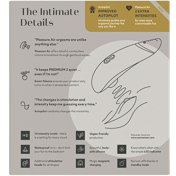 ボタンを押さなくてもお肌に触れるだけで吸引できるタッチセンサーを搭載!あのウーマナイザープレミアムがバージョンアップした「ウーマナイザー プレミアム2 (グレー)」。 吸引強弱機能は12から14段階へパワーアップ!パイロットモードを搭載することで、ボタンの操作をしなくてもウーマナイザーが吸引の強弱を自動でコントロールしてくれます。 振動は弱・中・強の3段階!予測できない楽しみを味わいたいという人はもちろん、カップルさんで使うときにもこれらの機能は大活躍♪ボタン操作に慣れていない方でも感覚的にお楽しみ頂けます。 素材はシリコン/ABS樹脂で2時間のフル充電で連続4時間の使用が可能です。 ※製造時期によりパッケージが異なる場合がございます。 ※こちらの商品は受注発注商品の為、ご注文から発送までに3、4営業日掛かる場合が御座います。 |