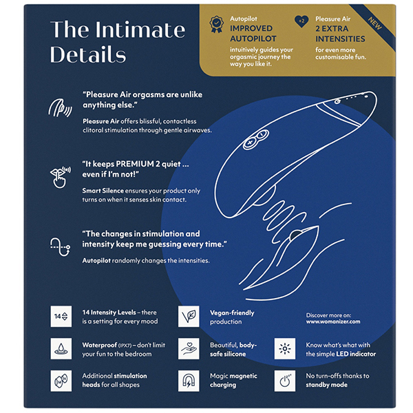 リアルなオーラルセックスでは体験できない快感が味わえる「ウーマナイザー プレミアム2 (ブルーベリー)」。 従来品からパワーアップした本作では、ボタンを押さなくてもお肌に当てるだけで吸引が自動でスタートする「タッチセンサー」を搭載♪お肌から離すと吸引も自動でストップするので、ボタン操作に慣れていない人でも感覚的に楽しめます。 また、強弱3段階の「パイロットモード」も搭載しているので予測できない楽しみを味わいたい!という人にもおすすめ。 ボタン操作をしなくても吸引の強弱を自動でコントロールしてくれるので、ゆったりとラグジュアリーな時間を楽しみたいときにも最適♪吸引強弱機能は12から14段階へ!素材はシリコン/ABS樹脂で2時間のフル充電で連続4時間の使用が可能です。 ※製造時期によりパッケージが異なる場合がございます。 ※こちらの商品は受注発注商品の為、ご注文から発送までに3、4営業日掛かる場合が御座います。 |