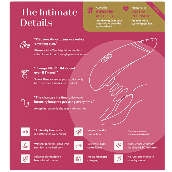 圧倒的な人気を誇るウーマナイザープレミアムが2へバージョンアップした「ウーマナイザー プレミアム2 (ラズベリー)」!強弱12段階から14段階へパワーアップし、従来の吸引バイブに新たに「タッチセンサー機能」と「パイロットコントロール機能」を搭載。 タッチセンサー機能では煩わしいボタン操作は必要なく、シリーズの中でも圧倒的に使いやすくなりました♪お肌に近づけると自動で吸引し、離すと自動でストップ!これならボタン操作に不慣れな人でも安心♪さらに予測できない楽しみを味わいたいという方のために弱・中・強3段階のパイロットモードを搭載。 ボタン操作をしなくてもウーマナイザーが自動で吸引の強弱をコントロールしてくれるので体感をじっくり味わいたいときに最適です!素材はシリコン/ABS樹脂で2時間のフル充電で連続4時間の使用が可能です。 ※製造時期によりパッケージが異なる場合がございます。 ※こちらの商品は受注発注商品の為、ご注文から発送までに3、4営業日掛かる場合が御座います。 |