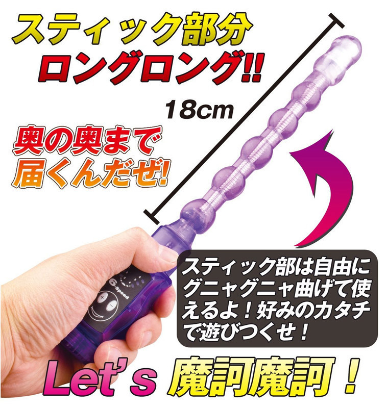 アナルの奥までブルブル刺激!芯がクネクネ曲がっちゃう6連ボールのスティックローター。 ●挿入部分18cm・前立腺にも楽々届くロングサイズ●スリムな先端に超小型パワフルモーターを搭載●ボタン送りで簡単に選択できる6つのバイブレーション●現在の振動をライトでお知らせ●単4電池3本使用。 中身スケスケのクリアボディ!U字やS字へと自在に変形する姿が面白い、実用的なローターです。 |