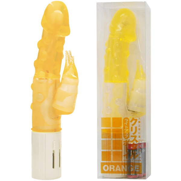 人間工学に基づいた最先端のバイブ「クリスタルボーイ オレンジ」。 美しいスケルトンボディは暗闇でも怪しく光り輝き、ムードは盛り上がることマチガイなし!本体の表面の大粒のイボイボに加えて、カリの直径は約3.8cmと存在感抜群!子機にいたっては3枚舌仕様。 さらに、スイングとバイブの個別動作が可能…などなど、至れり尽くせりの優秀バイブです。 単3電池×3本使用。 |