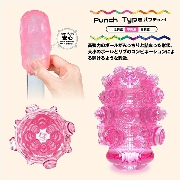 大粒デコボコ刺激がキュット締めつけ!裏返す事で未知なる体験と利便機能を持った変化する密集体ホール。 「Qutto−キュット−」は従来よりも突起が大きく、肉厚になった大粒のデコボコ刺激を搭載。 使用時に本体の凹凸面を内側に返すことで、内側に向かって大粒のデコボコ刺激が密集。 キュット締めつけることで、「未確認の触感」を体験することができます。 パンチタイプは、高弾力のボールがみっちりと詰まった形状です。 大小のボールとリブの組み合わせによる弾けるような刺激が特徴です。 この商品には個装のローションが付属しています。 |