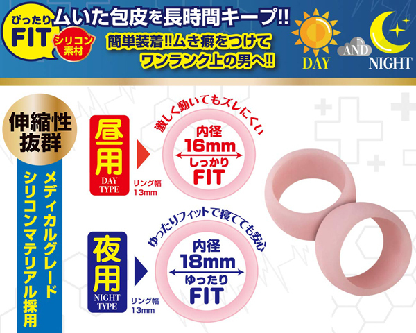 ムいて、付けて、包皮を長時間キープ!使い心地なめらかで伸縮性抜群な包茎矯正リングが2本セットで登場。 内径サイズの異なるシリコン素材のリングが2本ついているので自身のサイズやシーンに合わせて使い分けられる!ムき癖をつけてワンランク上の男へ…いざ、未知なる世界へ!<昼用タイプ>激しく動いてもズレにくい!しっかりフィットタイプ!<夜用タイプ>寝たまま付けても安心。 ゆったりフィットタイプ!<使用方法>包皮をムいて、カリクビの付け根に装着するだけ。 2つのリングはお好みに合わせてご使用ください。 ※リングを引っ張りすぎるとリングが切れる場合がございますのでご注意ください。 |