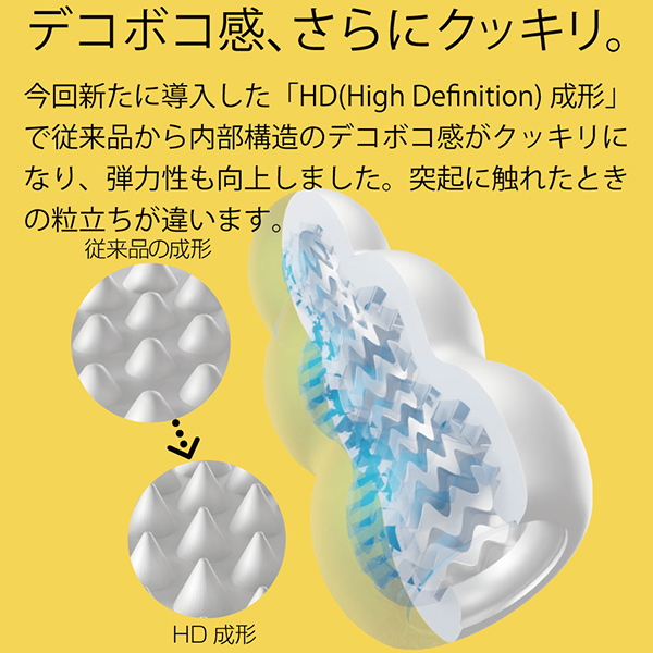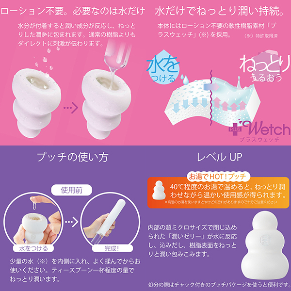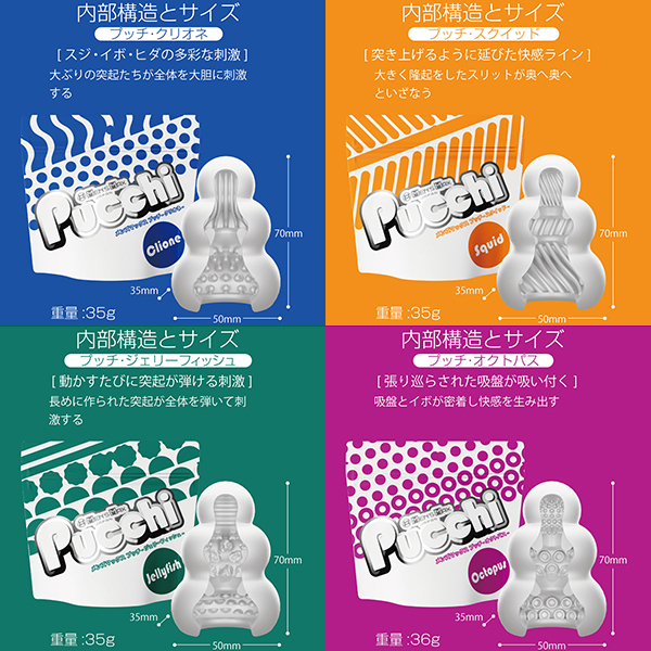 全てが新しくなったプッチ。 ポケットサイズのローション不要ホールプッチシリーズが生まれ変わって新登場。 軟性素材から内部の構造、パッケージ、全てが新しくなりました。 デコボコ感、さらにクッキリ。 今回新たに導入した「HD(High Definition)成形」で突起のデコボコ感がさらにクッキリになりました。 突起に触れたときの粒立ちが違います。 弾力感、さらにモッチリ。 「HD 成形」により軟性樹脂の弾力性も向上。 さらにモッチモチに、しなやかな素材になりました。 内部構造も、さらにハッキリ。 オリジナルシリーズ、スイーツシリーズ計8種類の内部構造をより精密な造形にリニューアル。 「HD 成形」とあいまってデコボコ感がよりハッキリわかる構造になりました。 生産工場を一新。 新型プッチシリーズは日本国内に新設した工場から生産。 最新の設備と厳密な品質管理で一つ一つ丁寧に作ります。 ローション不要、必要なのは水だけ。 ローション不要軟性素材「プラスウェッチ」水分が付着すると潤い成分が反応、ねっとりした潤いに包まれます。 <クリオネ内部構造>「スジ・イボ・ヒダの多彩な刺激」大ぶりの突起たちが全体を大胆に刺激する<ジェリーフィッシュ内部構造>「動かすたびに突起が弾ける刺激」長めに作られた突起が全体を弾いて刺激する<オクトパス内部構造>「張り巡らされた吸盤が吸い付く」吸盤とイボが密着し快感を生み出す<スクイッド内部構造>「突き上げるように延びた快感ライン」大きく隆起をしたスリットが奥へ奥へといざなう |
