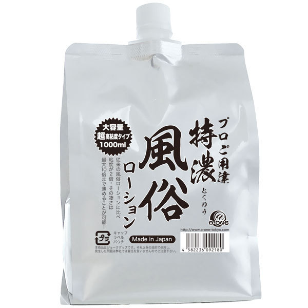大容量1リットル!風俗店御用達「風俗ローション」に超高粘度の特濃バージョンが登場。 従来の「風俗ローション」に比べ、粘度が約2倍!使用時に水やお湯で薄めれば、最大10倍の容量になるのでとっても経済的!ソープごっこやマッサージなどの本格的なローションプレイをご自宅で楽しめます!プロ納得の高品質ローションです。 |