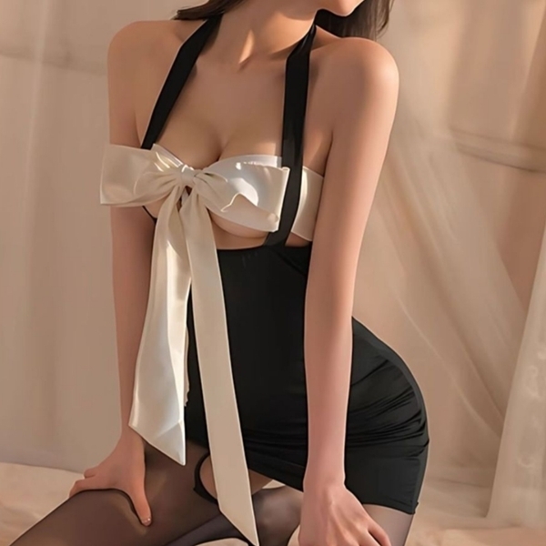 | 大胆でありながら可愛らしさも兼ね備えたボディコンワンピースセットです!セット内容はボディコンとTバックで、ストッキングは付属していません♪胸元に大きなリボンブラがあり、結び方次第で谷間の印象を自由に変えられます!ブラックの生地は着やせ効果とボディ引き締め効果が抜群で、ウエストからヒップにかけてのタイトなミニスカートが美しいラインを演出します♪背中は大胆に開いたホルターネック仕様で、後ろ姿も魅力的に見せます!動くたびに見えそうな限界ギリギリのミニスカートで、普段使いはもちろん特別なシーンにもおすすめです♪洗練されたデザインとスタイリッシュなフォルムで、魅惑的なコスプレ体験をお楽しみください!このセットで特別な時間を華やかに彩りましょう♪  |